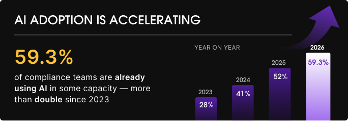 AI has moved from curiosity to reality inside compliance teams. 59.3% of respondents report already using AI in some capacity, and 75.5% say they are enthusiastic about using it. Over four years, AI adoption in compliance has more than doubled.